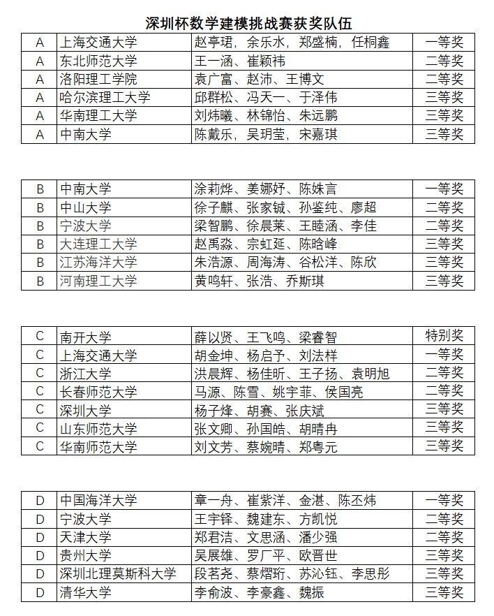 经过激烈的角逐和公示,69av 参赛团队最终荣获“深圳杯”数学建模挑战赛二等奖2项。祝贺所有获奖的同学们!