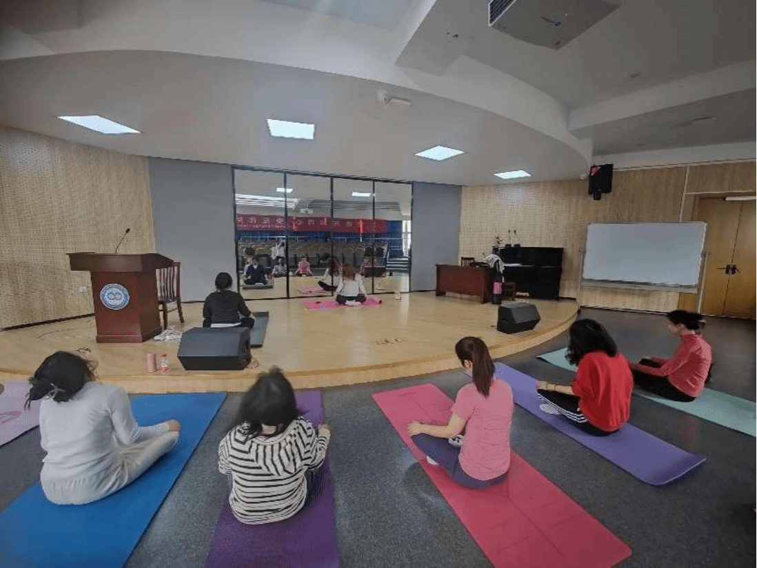 分工会特邀专业瑜伽教练,利用每周四午休时间,开展女教工瑜伽课堂。3月14日中午,第一节瑜伽课在9号楼113报告厅举行。