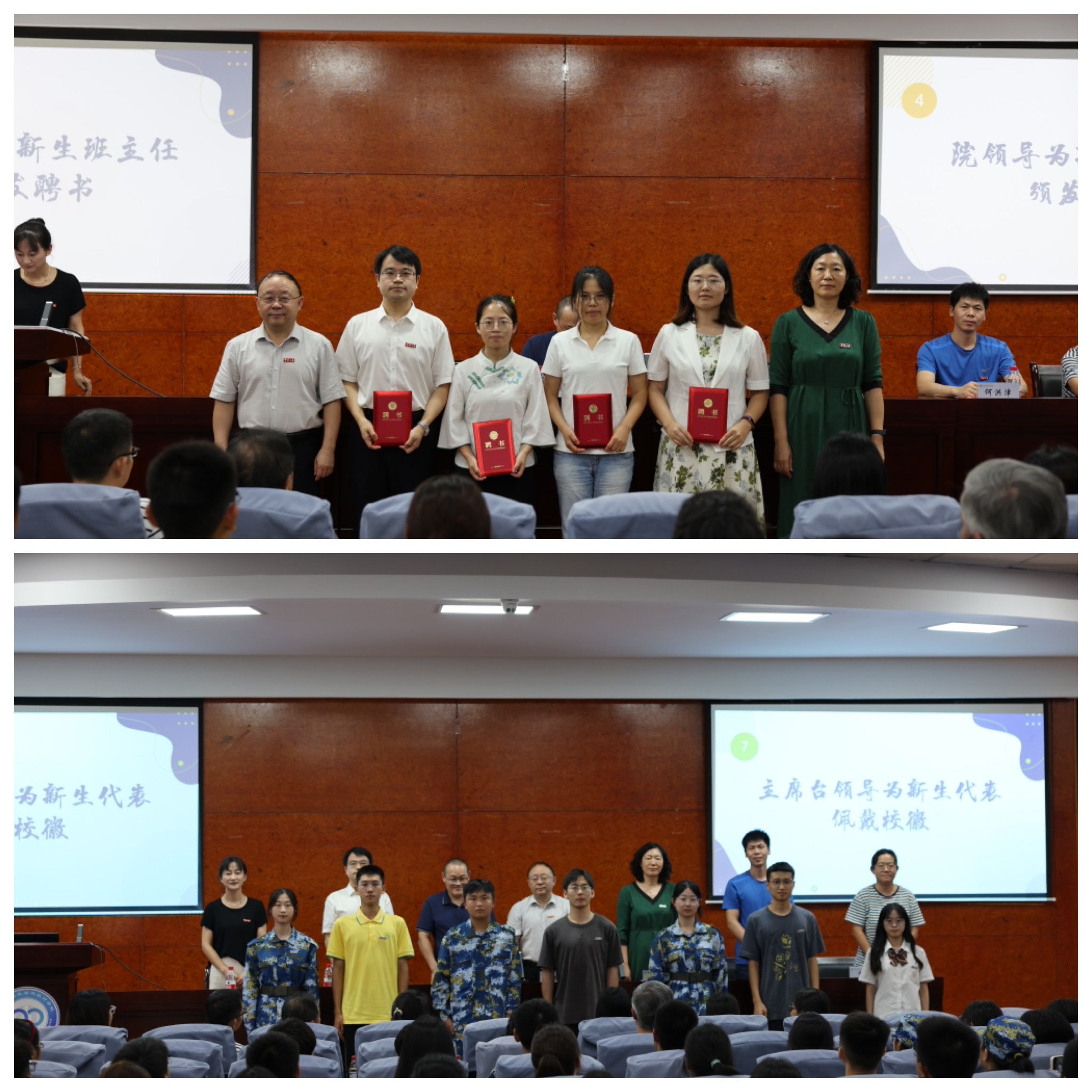 随后,学院领导为2024级班主任颁发聘书并为新生代表佩戴校徽。一张张聘书代表着学院对各位班主任的肯定与信任,一枚枚校徽承载着学院对同学们的鼓励和期许。