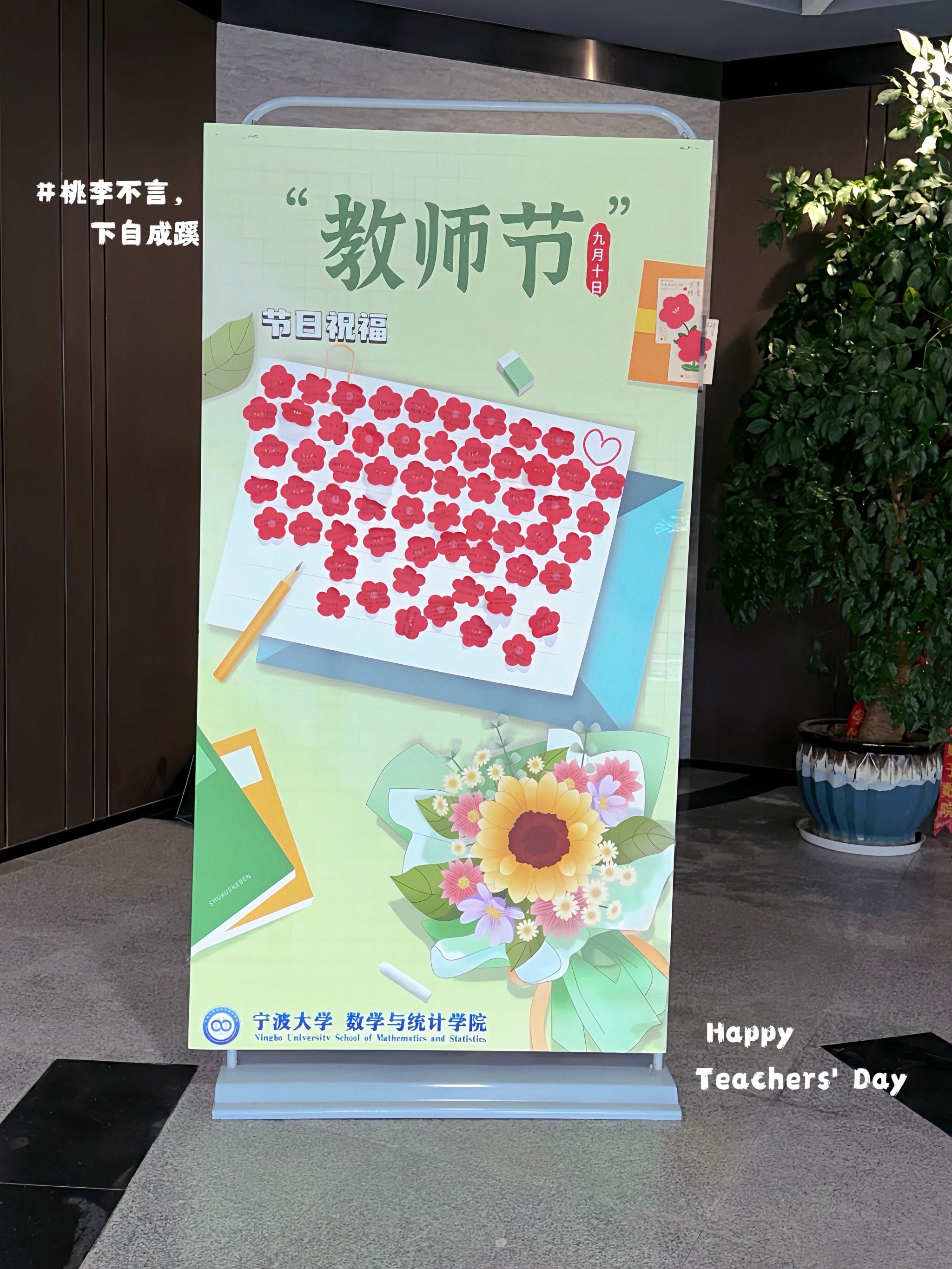 在学院大厅的教师节展板上,同学们用五彩缤纷的便笺纸写下了对教师们的温馨祝福和感激之情。有的同学用简洁的语言表达了对老师的感谢:“老师,感谢您的辛勤教导,祝您节日快乐!”;也有同学用幽默的方式表达了对老师的敬意:“老师,您的课堂就像数学公式一样,总是能解开我们心中的困惑,祝您教师节快乐!”每一张便签都承载着学生们的真挚心意,它们像一朵朵盛开的花朵,点缀在展板上,形成了一道独特的风景线。