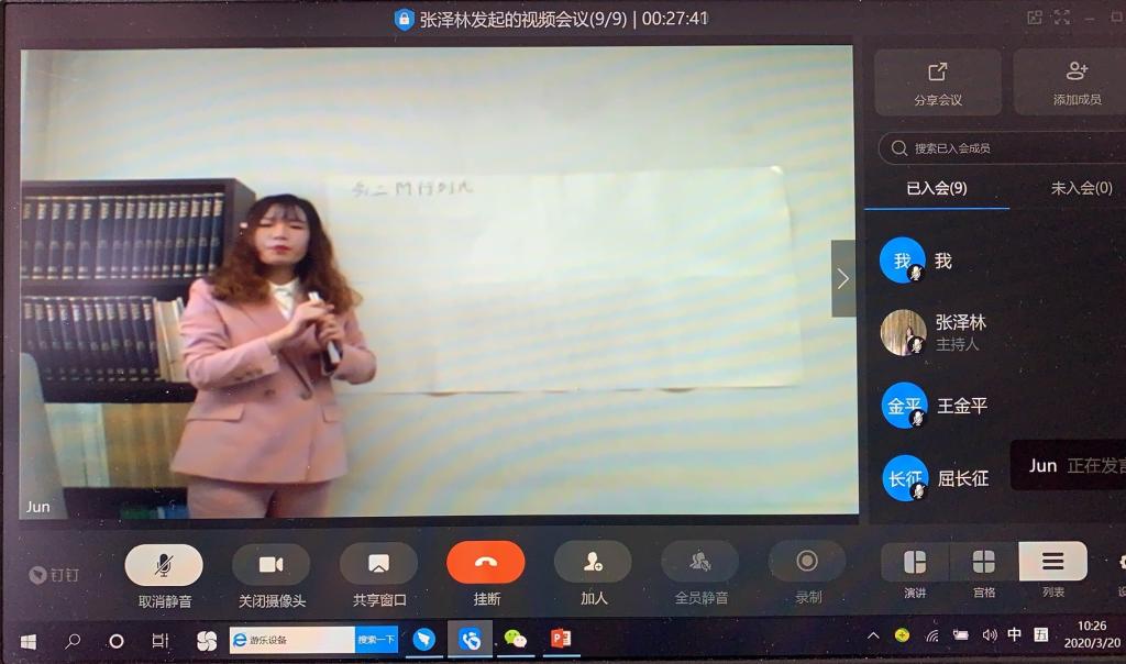 与线下面试流程一样,来自韩国建国大学的应聘博士通过钉钉共享屏幕PPT的方式,向评委介绍了个人基本情况以及目前的研究经历和成果,之后进行了数学专业的教学试讲。参加面试的评委们依次针对应聘博士的科研成果、研究内容和教学能力等方面进行线上互动问答。屈长征院长代表学院对面试情况进行总结,并对应聘者提出建议与要求。随后,俞金波书记单独面试考察了应聘者的思想道德素养和应聘岗位匹配性情况。