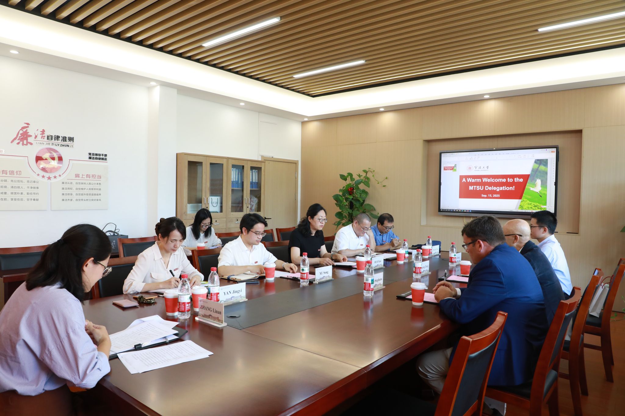 座谈结束后,学院向MTSU代表团赠送了越窑青瓷花瓶,寓意“精诚合作,花开并蒂”。双方与会代表合影留念,共同铭记这一深化友谊与合作的时刻。