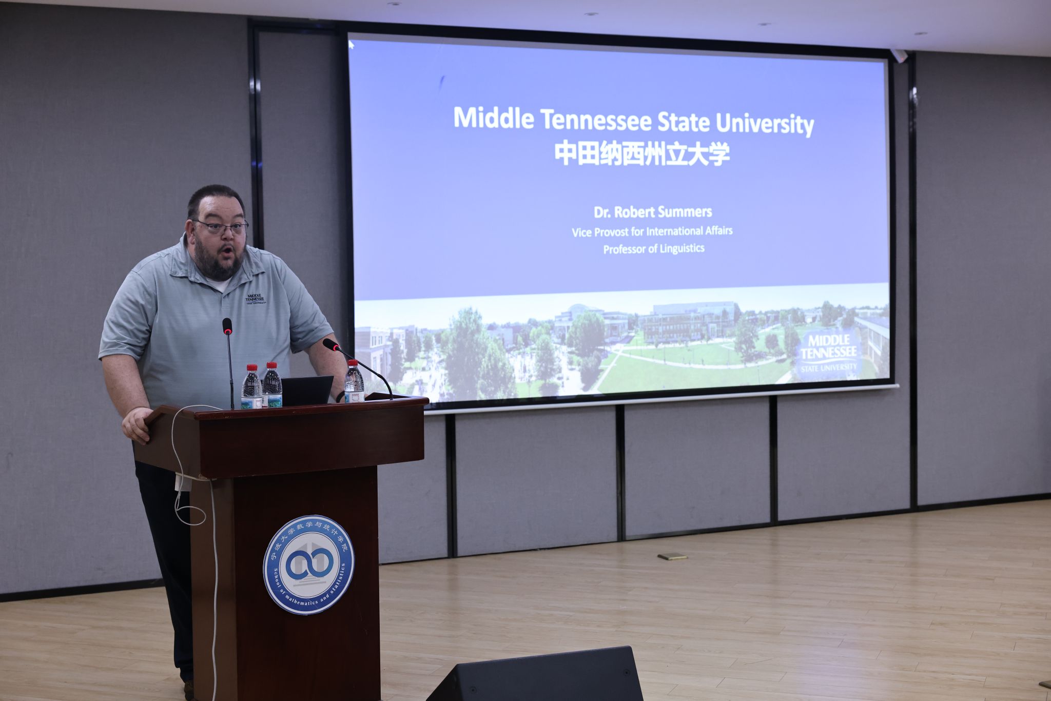当日下午,代表团还与精算专业的近80名学生举行了见面会。Robert SUMMERS详细介绍了MTSU的整体情况及国际学生支持政策,Chris STEPHENS和Lu XIONG就精算专业的课程体系、学习内容及发展前景进行了具体说明。此后学生提问环节气氛热烈,学生们就赴美留学申请、奖学金政策、学业与生活适应等关心的问题与MTSU的教授们进行了直接交流。