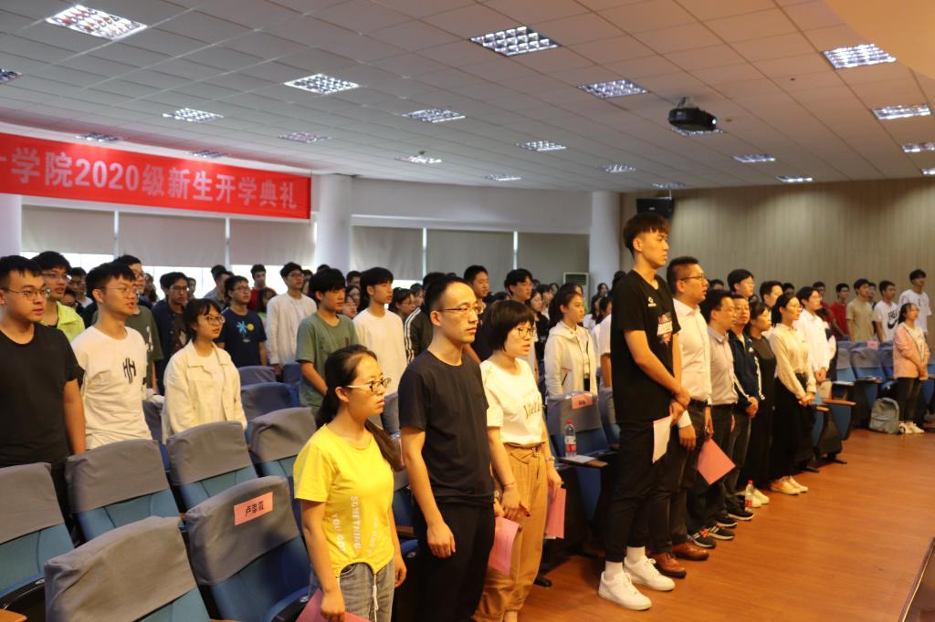 新生开学典礼在阳明学院315隆重举行,学院领导、各系主任、新生班主任以及2019级分流新生和2020级新生200余人参加,并邀请到2000级数学系校友沈锋与宁大男篮球员韩存昊作为特邀嘉宾出席本次开学典礼。