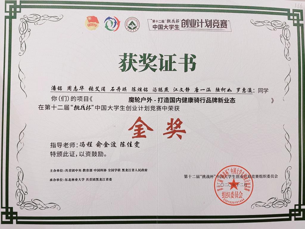 取得5金1银2铜的优秀成绩,我院由院冯程老师、俞金波老师、陈佳雯老师指导的“魔轮户外——打造国内健康骑行品牌新业态”项目荣获金奖,取得了这个赛事的学院最好成绩!