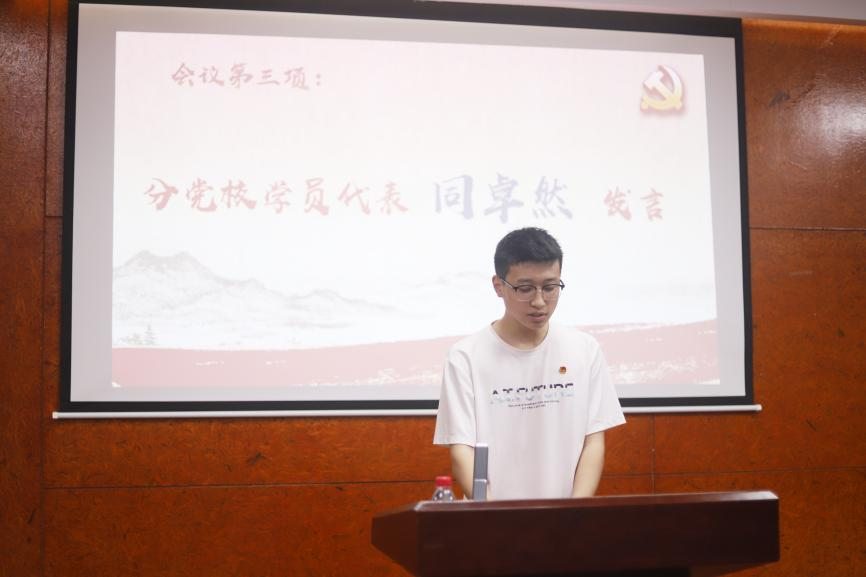 分党校学员代表同卓然发言,他表示作为一名数学学子,要明确自身努力方向,锤炼道德品行,培养创新思维。真正做到在理论上、思想上、行动上入党。