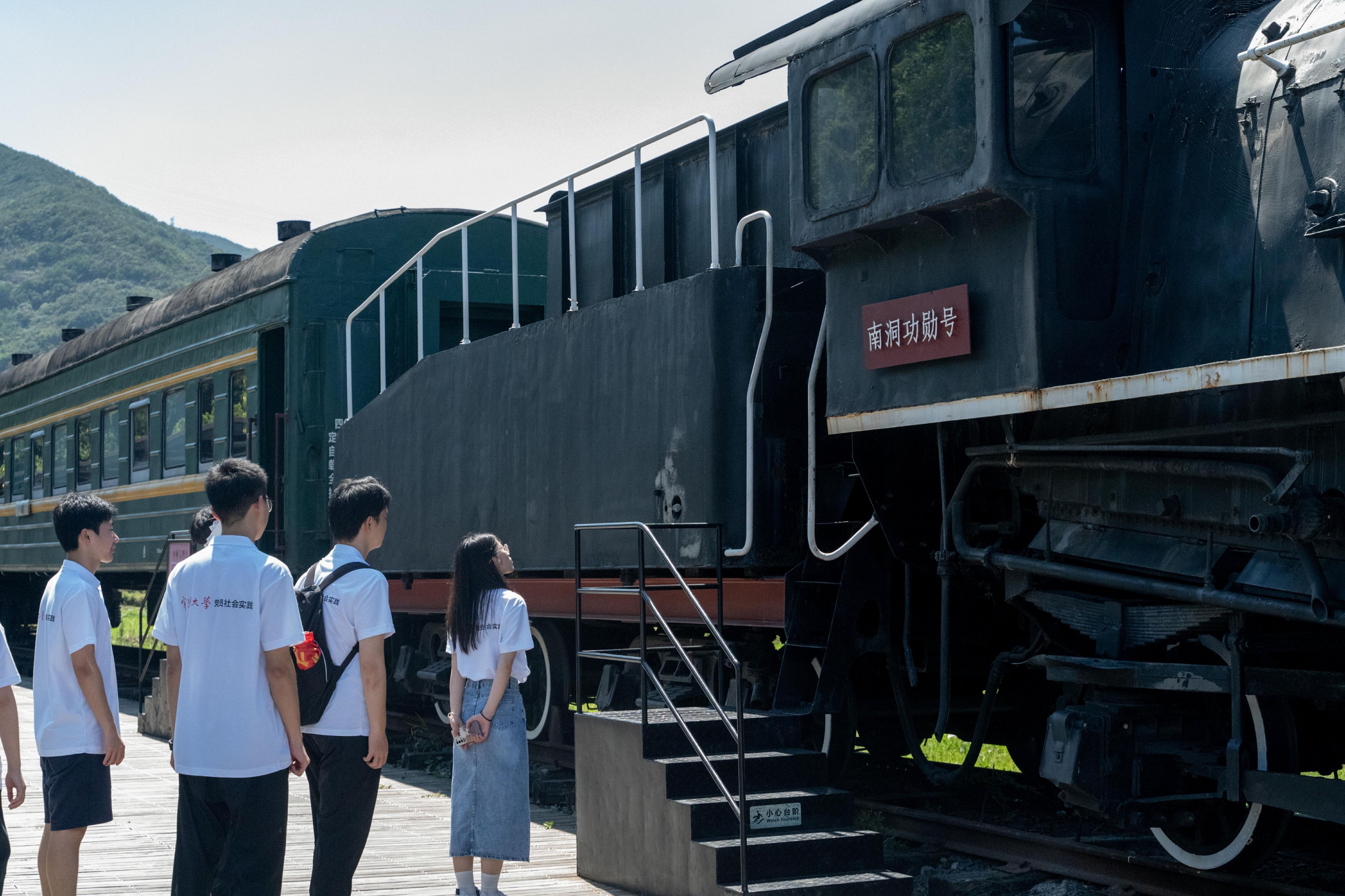 走出乡村艺术馆,实践团来到“功勋号”列车广场,工作人员感慨万分的向大家介绍,卫星发射基地“两弹一星”科学家曾乘坐这趟通勤专列前往祖国需要的地方,科研报国,因此取名“功勋号”。因海岛交通不便,这里的很多村民在这之前没有见过真正的火车,而这辆从“甘肃嘉峪关”远道而来的退役车是在舟山跨海大桥正式通车之际运来的,是党和政府努力打通海岛交通,加速舟山发展的期许与决心。一位村民非常自豪的告诉同学们“这辆火车是我们新建村的‘心脏’!”