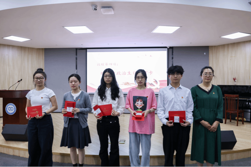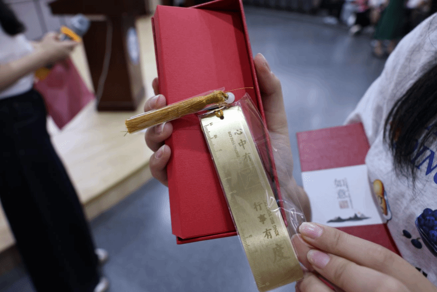在庄重温馨的"政治生日"环节,院党委书记霍妍为每位毕业生党员颁发专属政治生日贺卡与定制戒尺。这把戒尺,正面镌刻"心中有尺,行事有度"八字箴言,背面铭刻党员姓名与入党时间,既是对党员身份的庄重确认,更暗含"以尺为戒、以纪为度"的深刻寓意。霍妍书记手持戒尺阐释道:"这把'尺'既是丈量言行的标尺,更是守护初心的戒尺。入党时间标注你们的政治生命起点,姓名镌刻代表终身责任担当,愿你们始终心怀敬畏、行有所止。"