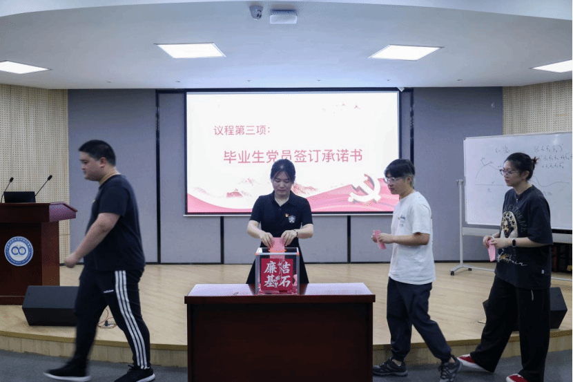 活动在铿锵有力的入党誓词中拉开序幕。全体毕业生党员在党建辅导员陈小强的带领下,面向党旗庄严宣誓,一句句誓言唤醒初心使命,传递出青年党员对党的无限忠诚。党委副书记姜萍为毕业生党员送上廉洁从业寄语,强调青年党员要坚守廉洁底线,将党性修养融入职业发展。随后,全体党员集体诵读《廉洁从业承诺书》,郑重签署姓名并投入"廉洁基石"箱,以行动诠释"廉洁于心、践诺于行"的坚定决心。