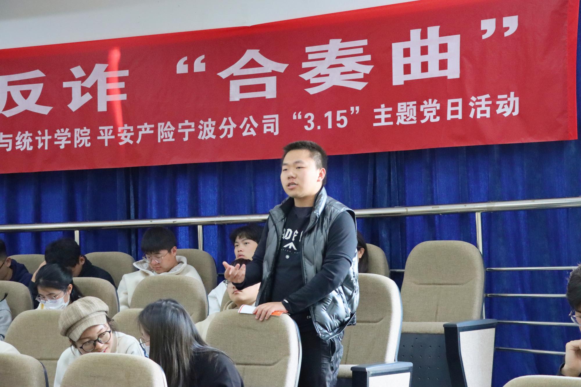魏国胜同志通过问询的方式与台下互动,学生党员积极分享身边因“熟人”求助被骗的真实案例,并用现场所学的反诈知识进行破局,知行合一构筑防范电信网络诈骗“防护圈”。
