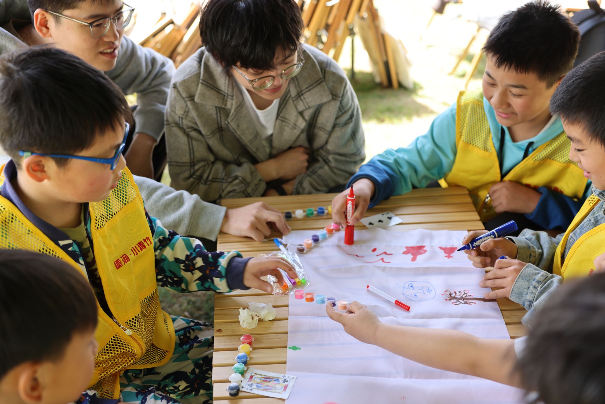 的党员们用扑克牌玩出了新花样。21位“小青竹”秒变四大天团,纯白画布上诞生会说话的队旗——国潮版哪吒踩着风火轮跃然旗上;星辰大海主题的航船正破浪前行;更有“梅”有烦恼队把扑克元素玩出谐音梗(梅花队谐音“没烦恼”)。学院本科生第一党支部的预备党员王毓妍揭秘:“这波分队操作既暗藏‘随机性’的知识点,又能瞬间破冰!”